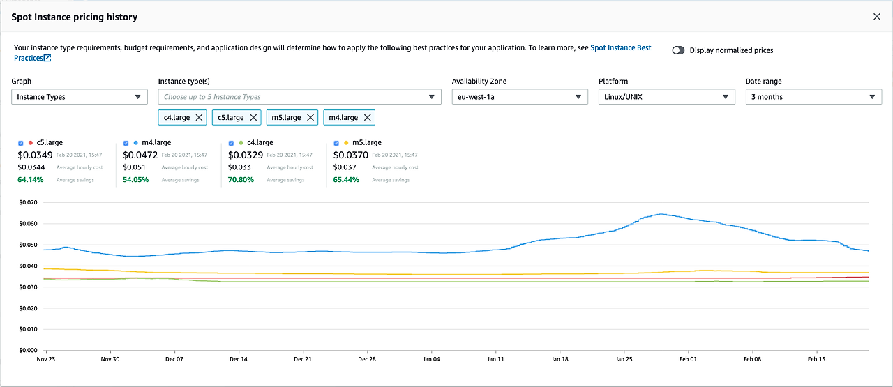 - 가격 용량 최적화(price Capacity Optimized) : 먼저 사용 가능한 용량이 가장 큰 풀을 선택하고, 그중 가격이 가장 낮은 풀을 선택하는 전략으로 대부분의 워크로드에 가장 적합한 선택이다.