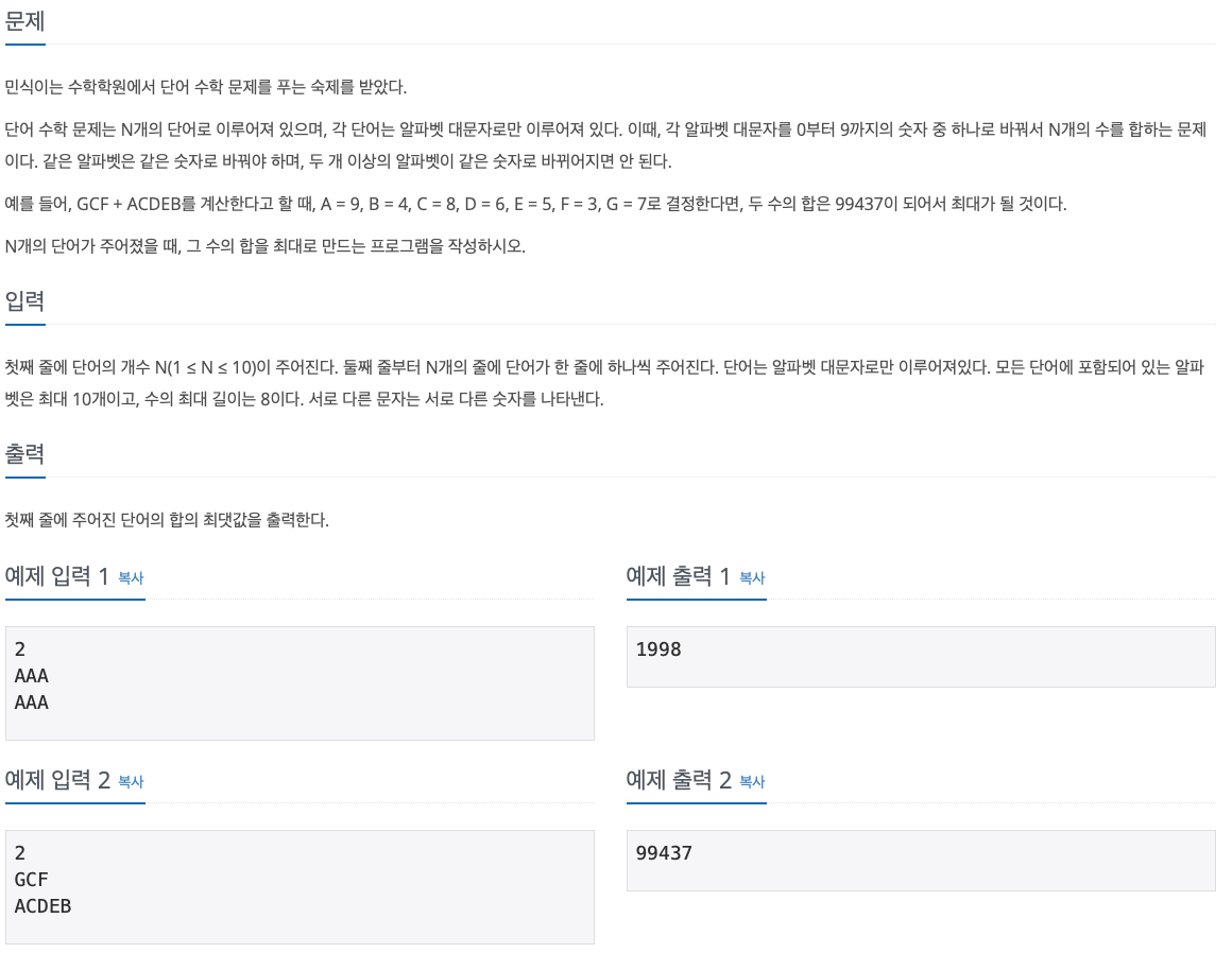 그리디 알고리즘에 대한 문제로 문제 해결 자체에 대한 아이디어를 떠올리는 데에 오랜 시간이 걸리진 않았다. 결국 크기를 결정하는 것은 자릿수가 높은 것일수록 큰 숫자를 배정받아야 한다는 아이디어를 이용했다. 또한, 최대 10번 반복되기 때문에 10의 지수승을 자릿수의 값으로 배정함으로써 자릿수가 높은 것이 더 큰 영향을 미칠 수밖에 없게 했다.