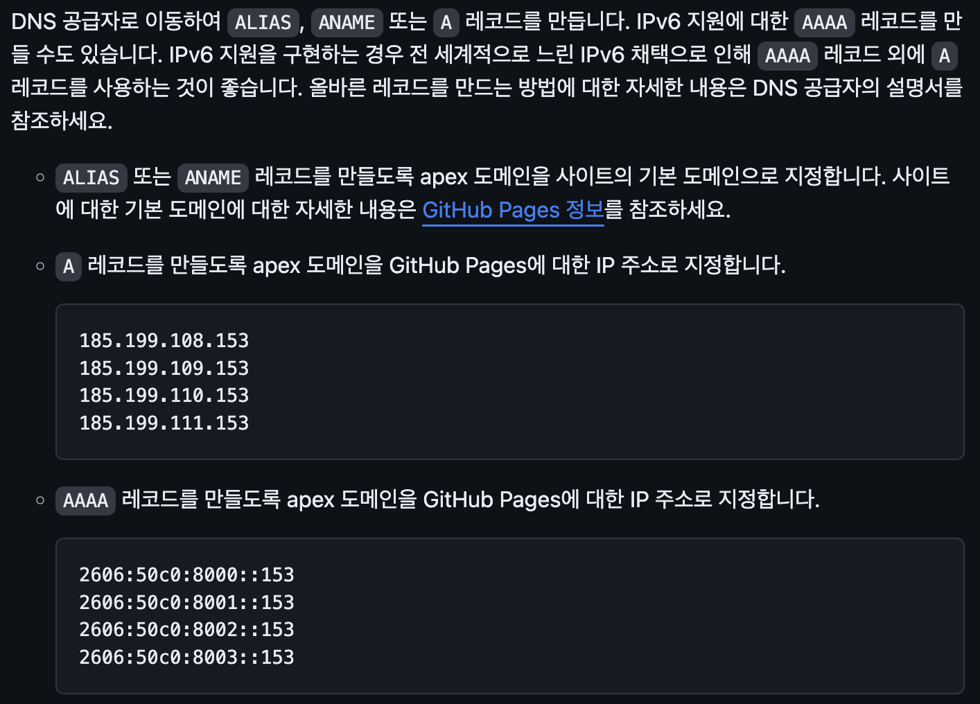 프로젝트 진행 중 프론트 팀원 한 분께서 부탁을 하셨다. 앱 배포를 위해 조직 페이지가 필요하여 github.io로 배포해 두었으니 저희 도메인에 연결해 주세요!라는 말과 함께 A, AAAA 레코드를 보내주셨다.
