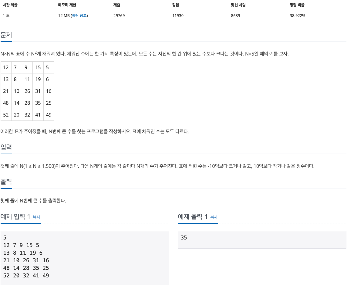 n번째 큰 수가 뭐지? 에 대해 처음에 바로 이해하지는 못했다. 2차원 배열이기 때문에 어떤 행 혹은 열에서 찾으라는 의미인 줄 알았기 때문이다. 하지만 단순하게 정렬한 뒤에 찾으라는 소리였다.