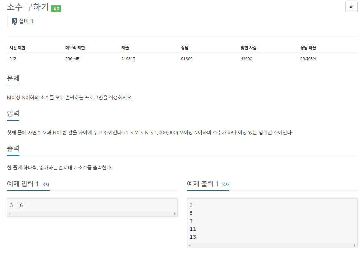 주어진 두 수 사이의 소수를 구하는 문제이지만 별도의 구간에 대한 소수를 찾는 것보단 최종 값까지의 소수를 모두 구한 뒤 다시 구간에 맞는 소수를 출력 하는 것이 더욱 효율적이다.