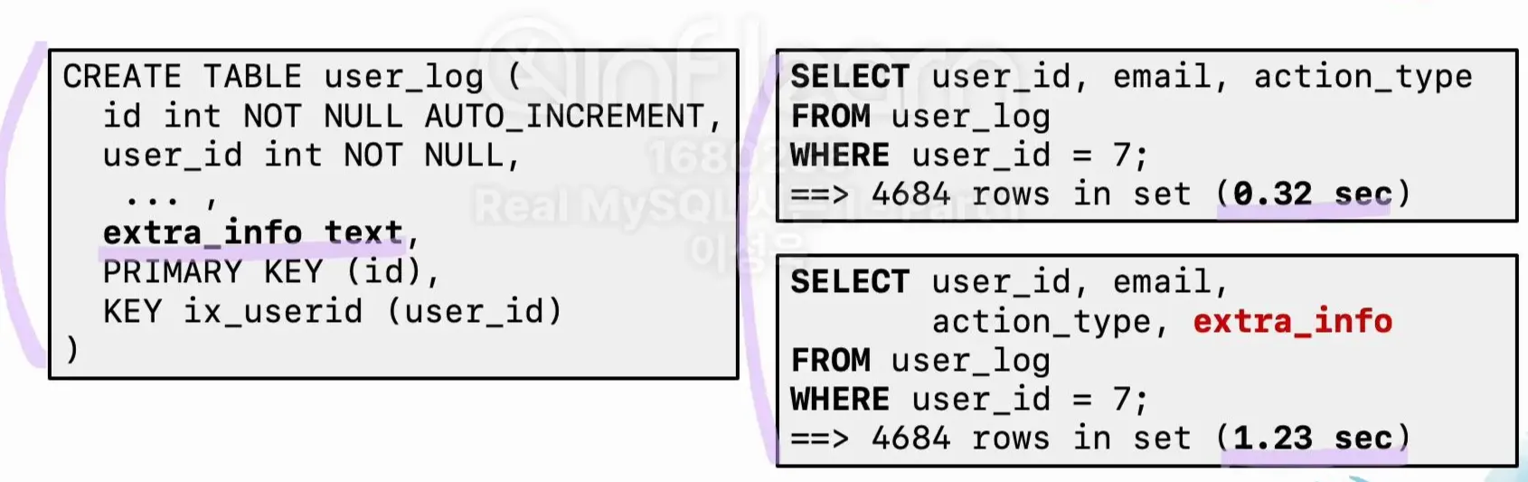- MySQL의 InnoDB 스토리지 엔진은 하나의 레코드 크기가 데이터 페이지의 절반 크기보다 큰 경우에 레코드에서 외부로 저장할 가변 길이 컬럼을 선택하게 되고, 그렇게 선택된 컬럼은 별도 외부 페이지의 데이터가 저장된다.