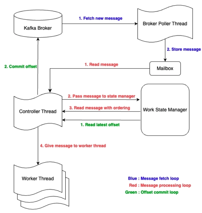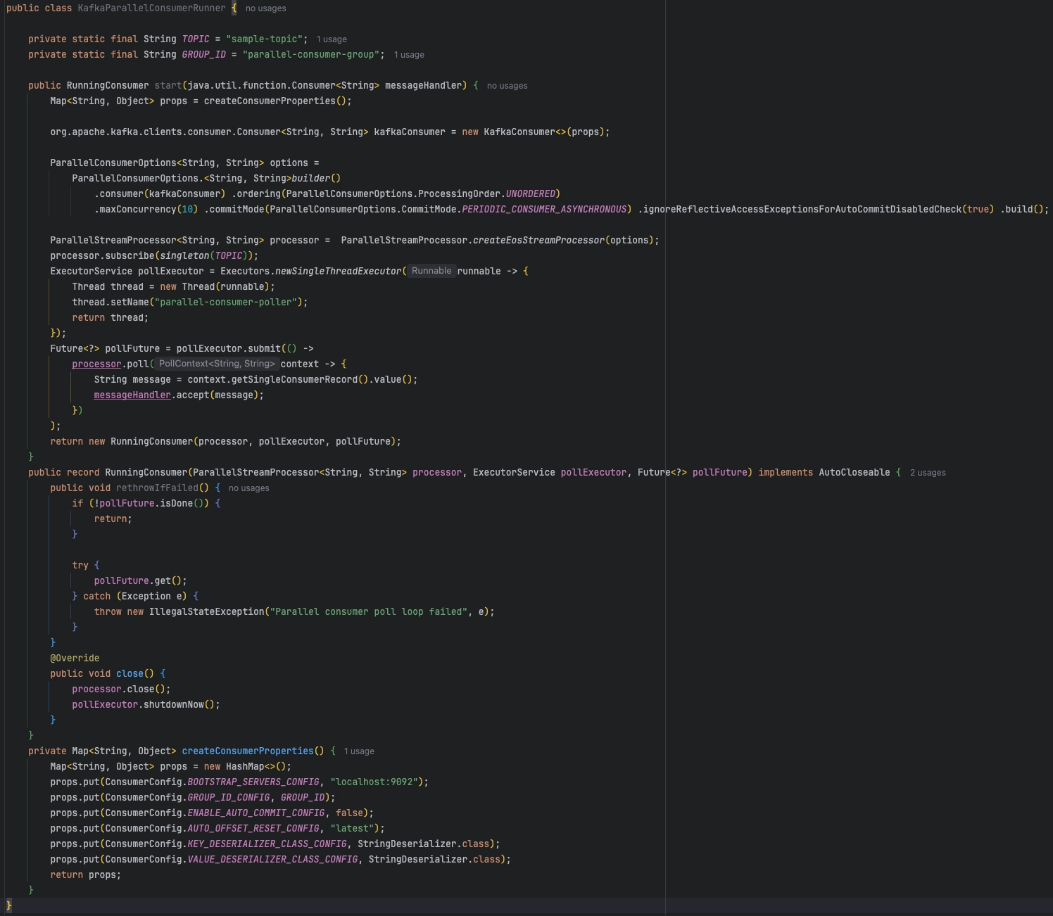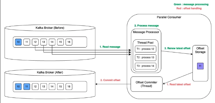 2. 일반 Kafka Consumer에서 애플리케이션 레벨로 스레드 풀을 붙여 병렬 처리하려면 offset commit과 ordering 보장, retry 처리를 직접 관리해야 해서 구현 복잡도가 높다. Parallel Consumer는 이 부분을 감싸 주고, 개발자는 처리 함수에 더 집중할 수 있도록 설계되어 있다.