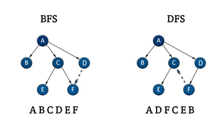 BFS는 너비 우선 탐색을 진행한다. 위의 그림을 보면 루트 노드에서 시작해서 인접한 노드 순으로 방문하며 탐색을 진행하는 것이다. 따라서 루트 노드인 A에서 시작하여 그다음 인접 노드 B, C, D를 탐색한 후 그것의 인접 노드인 E, F 순으로 탐색을 마친다.