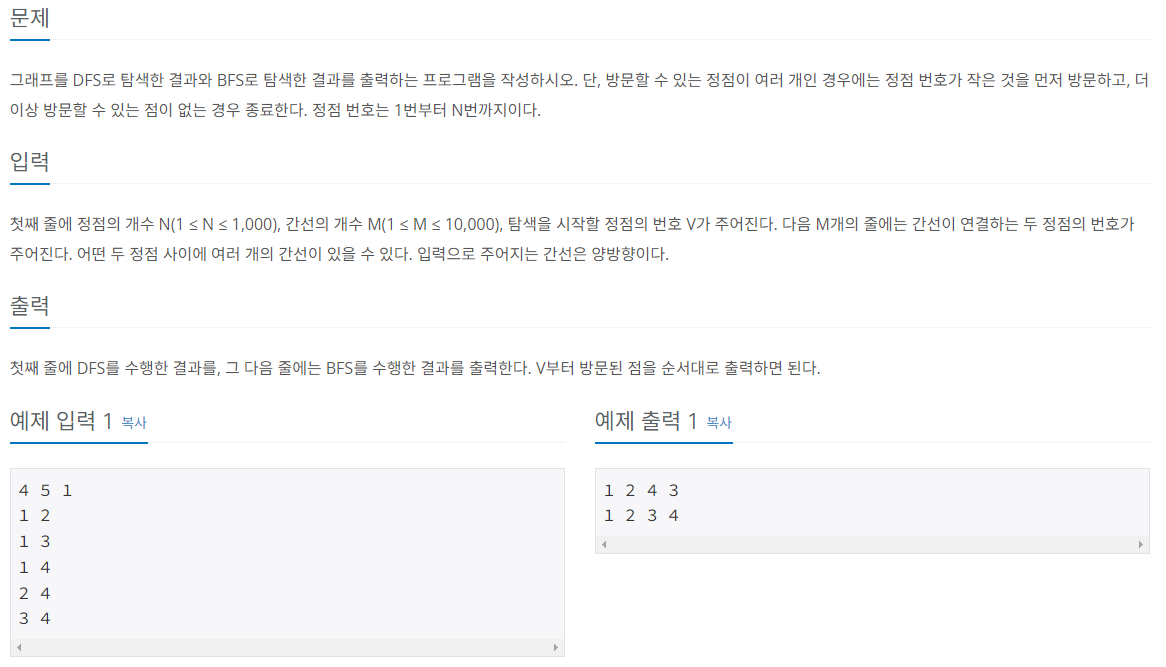 첫째 줄에 정점의 개수 N(1 ≤ N ≤ 1,000), 간선의 개수 M(1 ≤ M ≤ 10,000), 탐색을 시작할 정점의 번호 V가 주어진다. 다음 M개의 줄에는 간선이 연결하는 두 정점의 번호가 주어진다. 어떤 두 정점 사