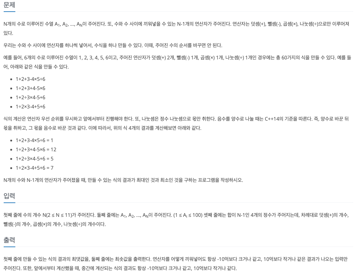 연산자의 배열을 따로 두고 진행한다. 이때 재귀적 호출을 이용하여 모든 경우의 수를 처리한다.
