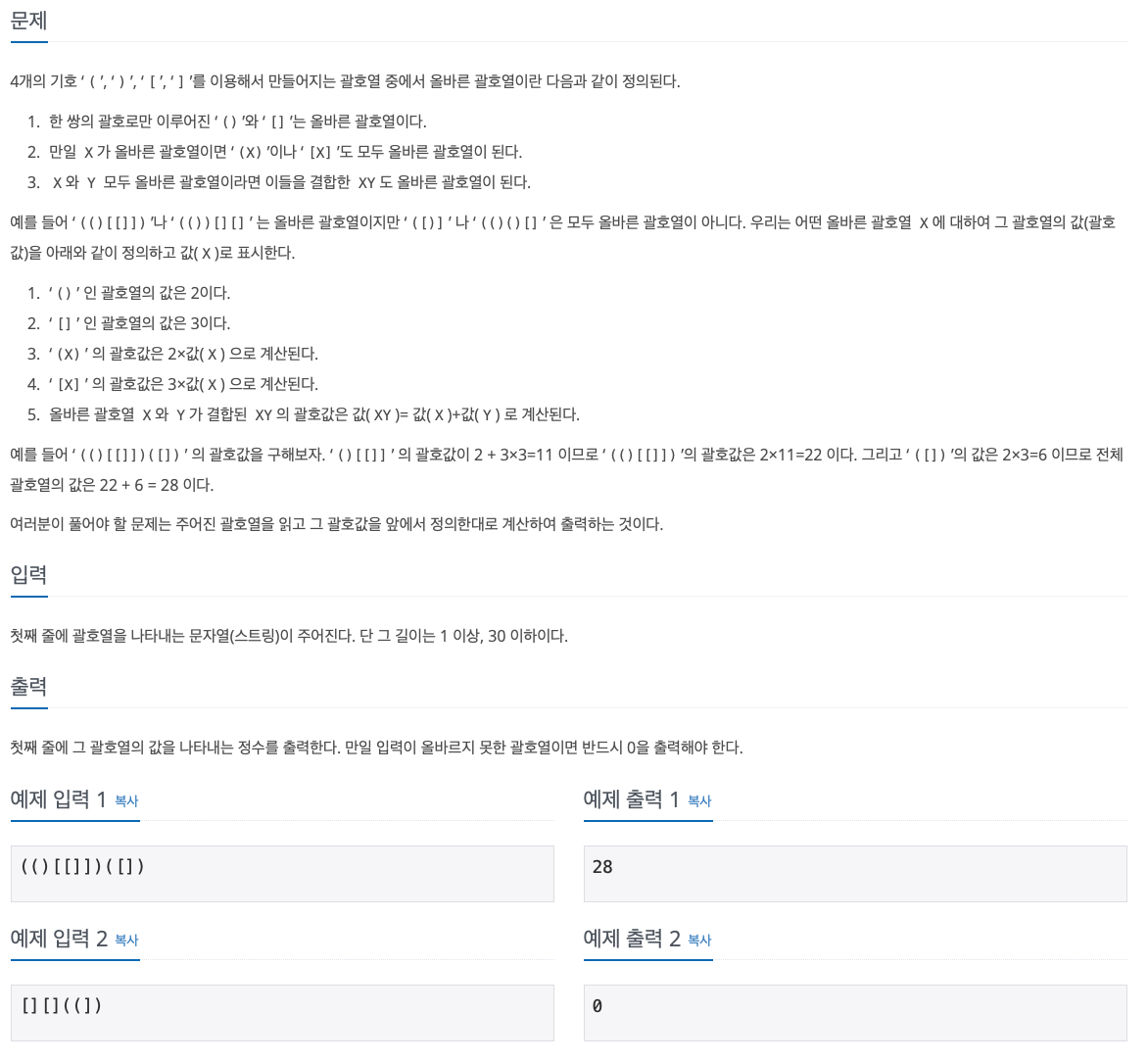 (()[[]])([])’ 의 괄호값을 구해보자. ‘()[[]]’ 의 괄호값이 2 + 3 ×3=11 이므로 ‘(()[[]])’의 괄호값은 2 ×11=22이다. 그리고 ‘([])’의 값은 2 ×3=6 이므로 전체 괄호열의 값은 22 + 6 = 28이다.