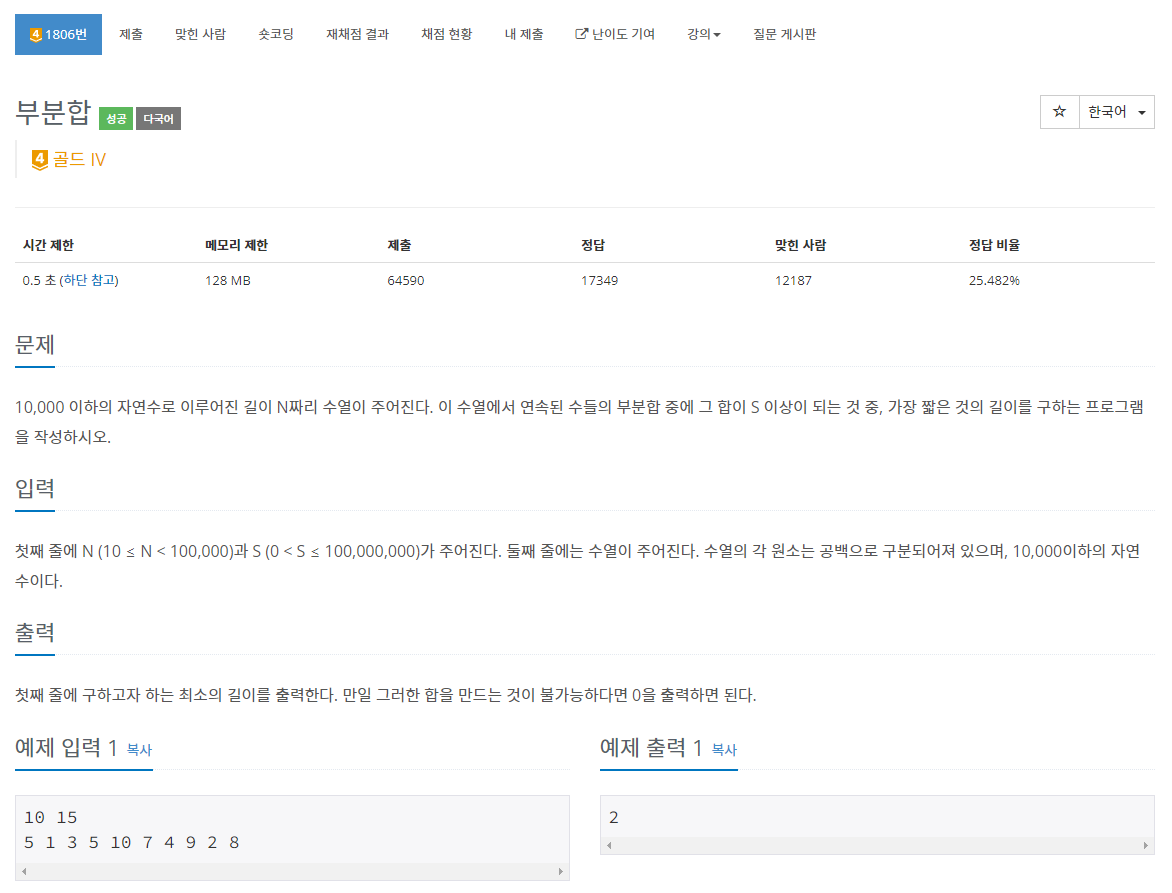 문제를 처음 읽고 투포인터 문제라는 것만 알 수 있다면 전혀 골드4 수준의 문제는 아니라고 생각한다. 알고리즘 강의에서 투포인터를 이미 접한 적이 있어서 어렵지 않게 해결 할 수 있었다.