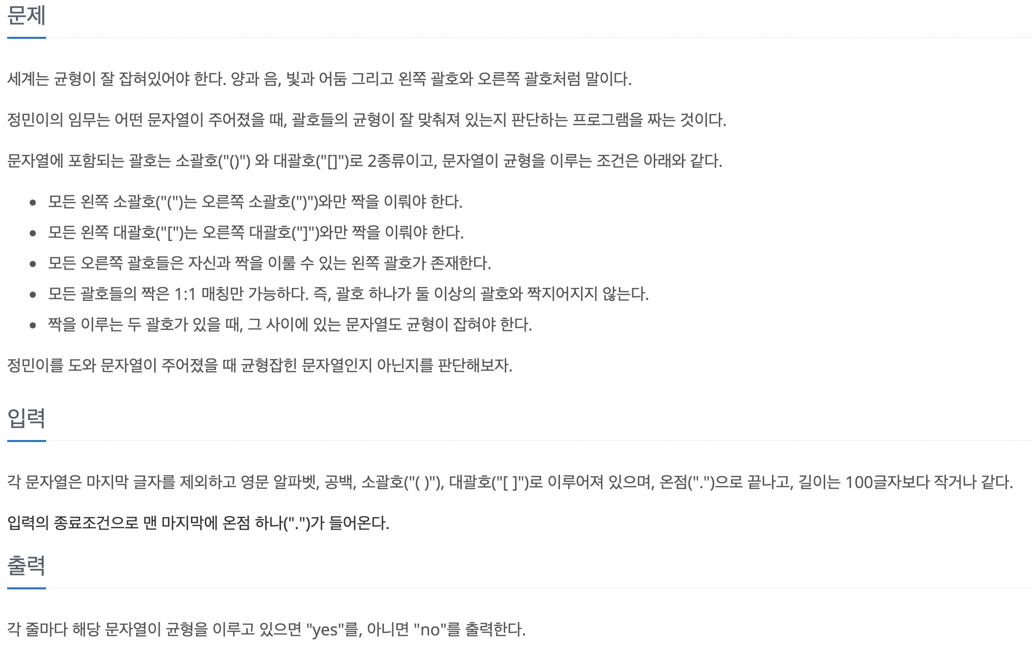https://www.acmicpc.net/problem/4949 문제 풀이 import java.io.*; import java.util.*; public class Main { public static void main(String[] args) throws IOException { BufferedReader br = new BufferedReader(new InputStreamReader(System.in)); StringTokenizer st; while (true){ String test = br.readLine(); if(test.equals(".")){ break; } Stack stack = new Stack(); int check = 0; for(int i = 0; i < test.len..