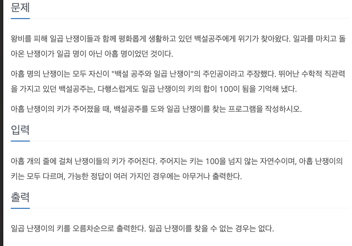 https://www.acmicpc.net/problem/2309 문제 풀이 import java.io.*; import java.util.*; public class Main { public static void main(String[] args) throws IOException { BufferedReader br = new BufferedReader(new InputStreamReader(System.in)); int[] height = new int[9]; int sum = 0; for(int i = 0; i < 9; i++){ height[i] = Integer.parseInt(br.readLine()); sum += height[i]; } int idx1 = 0, idx2 = 0; for(in..
